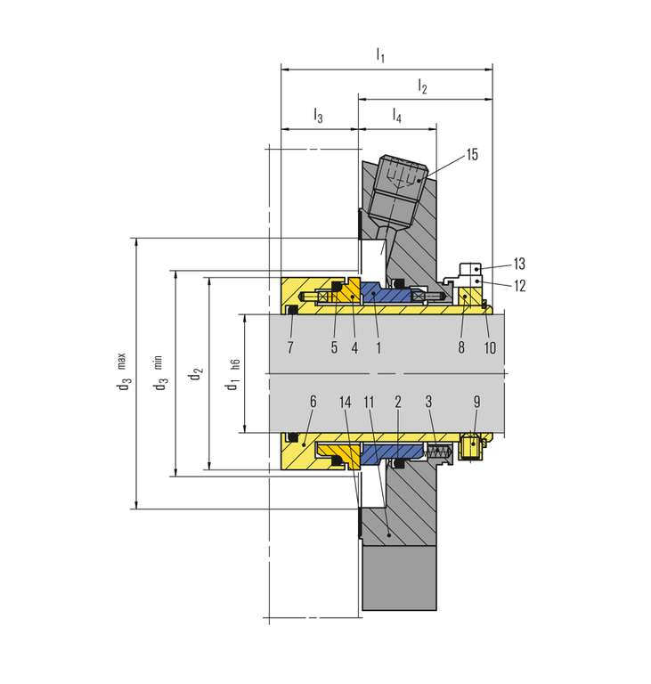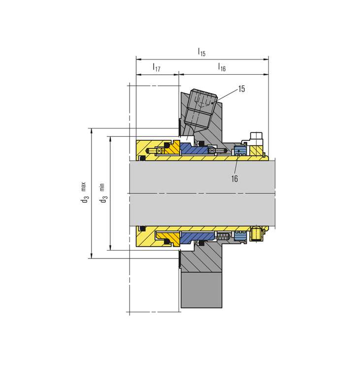 Single seal for standard (S) and big bore (B) seal chambers. Same as Cartex-ASPN and -ABPN but with throttle ring (item 16) The cover has auxiliary connections for flushing and quench.